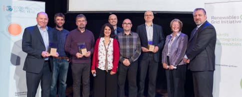 2015 Award winners Fintan Slye (EirGrid), Simon de Voghel (LIFE Elia-RTE), Gérard Jadoul (LIFE Elia-RTE), Antonella Battaglini (RGI), Olivier Feix (Elia Group), Johan Mortier (Elia Group), Leif Lüdemann (ESCSH), and jury members Marie Donnelly and Baard Eilertsen.