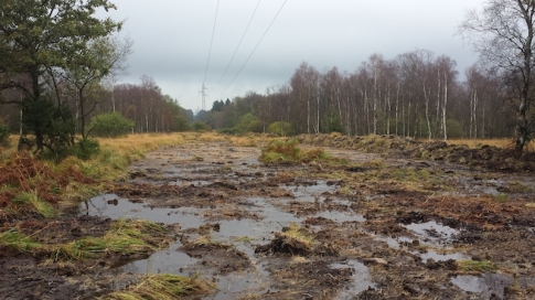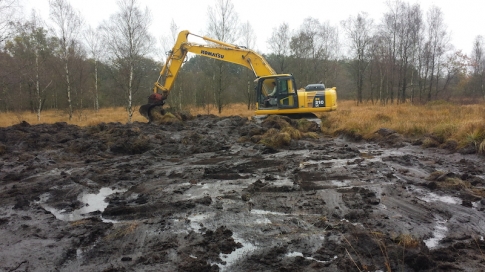 Enfin, cette visite conjointe de la Commission et d'Astrale s'est terminée sur le site de la forêt communale de Hargnies où une machine terminait les travaux de restauration d'habitats de tourbières : creusement de mares, construction de diguettes retenant l'eau et étrepage de larges zones pour favoriser le réveil de la banque de graines.